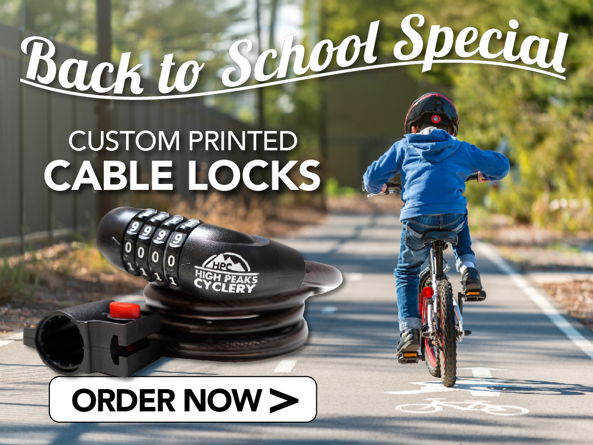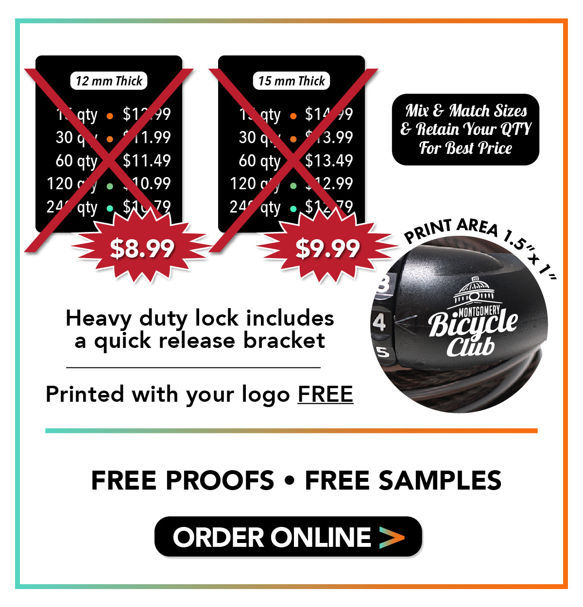 Heavy duty 12mm or 15mm lock includes a quick release bracket, and is printed with your logo or website FREE!